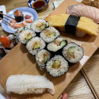 平日予約なし1名で13時過ぎに来店。 店内は客2組で空きがあり、快く案内いただけた。初心者でも入りやすい温かい雰囲気がある。 特選11貫のシャリ軽めと日本酒(金澤屋)1合を注文。日本酒は辛口が多く、食べ合わせを良く考えられたラインナップでありがたい。 1貫目でシャリの大きさを確認してくれる。大将が優しい。 赤酢のシャリと肉厚で熟成されたネタがどれも非常においしく、口いっぱいに旨味という旨味が広がっていく。最高! はじめにワカメの酢の物が来て、そこから握りとなる。 イカ→金目鯛→赤身→中トロ→コハダ→かんぱち→帆立→ネギトロ(巻物代わり) あと写真がないがいくらと貝があった。最後は汁物。 そこまでカウンター寿司を食べ歩いたりはしていないが、今まで行ったお寿司屋さんの中で1番居心地がよく、美味しいと感じた。シャリは元々軽めのお店なので次回からは小さめにしなくてもいいかも。 近い...続きを食べログで見る