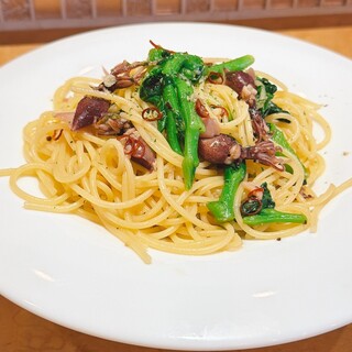 2020年10月25日 松戸に来ています。 今日は仕事場のシステムメンテナンス日で午前中のみの日。 仕事終わりにオカンと松戸で待ち合わせ。 ずっと来てみたかったこちらを訪れました。 日曜日のため予約じゃないと駄目かな?と思いながら伺ったところ大丈夫でした♥️ レガーロシェアコース(1人前/2200円)を注文。 レガーロシェアコースは、前菜(鯛のカルパッチョ)、本日のパスタ&ピッツァ、ドルチェ(レモンシャーベット、パンナコッタ)、カフェ(コーヒーor紅茶)が付いています。 なおパスタは、千葉県産イワシ玉ねぎパン粉のスパゲッティシチリア風。 ピッツァは、プロシュートとセルバチルッコラのピッツァをチョイス。 前菜の鯛のカルパッチョは、季節を感じられるピンクと黄色の菊が散らされており色鮮やかで見た目だけでも美味しそう✨鯛の切り身が2人で10切れほどあってボリュー...