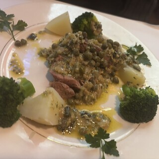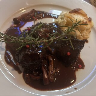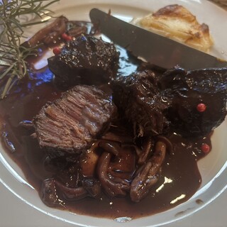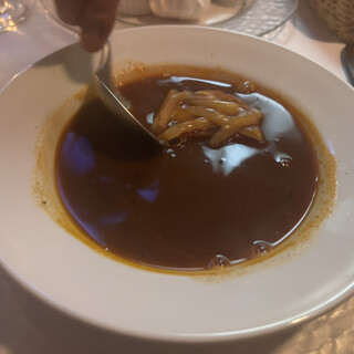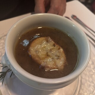 今月はなぜか、フレンチづいてしまいましたが、こちらのスペシャリテ、大好きな魚のスープがいただきたくて、久しぶりに来ました。 本日は初来店の娘も一緒で。 久しぶりなのでよくわからなかったのですが、魚のスープとかメインを選ぶなら、ディナーコースにした方がお得、と言う事で、熟考の末、ランチコース(メインはトリッパ)とディナーコース①(魚のスープ +¥1,100 牛タン)と、ディナーコース②(オニオングラタンスープ、牛ほほ肉の煮込み +¥880) をお願いしました。 ファーストドリンクは白ワインクラス(ソーヴィニヨンブラン)、赤ワインはギガルのローヌにしました。 久しぶりの魚スープは、そういえばこんなだったかな?という感じで、カリカリのバゲットに、ニンニクとルイユ、チーズを乗せて、スープに入れて一緒にいただく、と言うものでやっぱり美味しい❣️でした。 牛タンはケーパーとかのった、...