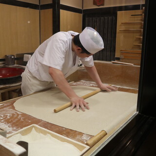 厳選された国産そばを玄そば(殻のついたまま)で仕入れ、毎日自社工場で製粉、美味いそばの「三たて」(挽きたて、打ち立て、茹でたて)を守っています。 料理は、蕎麦だけではなく、蕎麦前と呼ばれる一品料理も、定番から旬の品まで、常に30種類ほどを提供しています。アルコールも各種揃えており、おひとりさまからご宴席まで、ご家族連れからご接待まで、と幅広いお客様に、幅広い用途でご利用いただいております。 手打ち場は客席に向かって設置され、待合いのお客様を飽きさせることなく、職人もお客様に「見られる」ことで緊張しながらも気合の入った蕎麦打ちを披露しています。通常閉鎖的なキッチンも、当店はガラス張りで客席を見渡すことができ、その先の大きな窓からは四季の庭が眺められ、と「良くも悪くも」開放的な店舗設計です(笑)