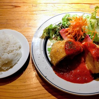 平日オープンと同時に伺いました。 徐々に席が埋まっていき、20分後には満席状態です。 カウンターだけでなく、広めのテーブルもあるので、タイミングによっては大人数でも入れそうです。 ランチはセットのみで、コルドンブルーをいただきました。 10分ほどで提供いただきます。 鶏肉は胸肉のようですが、かなりしっとり。生ハムが中にはいっており、スモーキーな香りです。チーズもたっぷり入っていて、飽きがきません。 トマトのソースはやや塩味がきいていますが、パンに合います。 メインだけでもかなりボリューミーです。 パンはおかわり自由だそうですが、ホールの方が1人しかおらず声をかけるタイミングを逃して断念。 食後にセットのホットコーヒーをいただきました。 コーヒー以外は食事と同時に提供されており、その辺りもいろいろと配慮を感じます。 以前よりやや値上がりしましたが、スープやド...続きを食べログで見る