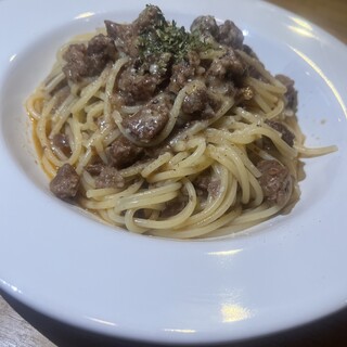 敷地内の奥まった場所にあるため、意外と気付きにくい隠れ家ですが、このゾーンは通りかかる度に気になっていました。 このお店の魅力の一つは、コースではなく単品でも注文できる飲み放題です。さらに、1時間ごとに延長できるというのは、飲兵衛にとっては嬉しいサービスです。 ビールやスパークリングワインも含まれており、1時間1000円という価格も魅力的です。 予約はパテ屋さんでしていましたが、なぜかこちらのお店に案内されました。最初は少し戸惑いましたが、居心地は悪くなく、お店の方の接客も緩やかな中にも丁寧さが感じられ、心地よい雰囲気でした。 料理は肉料理が中心ですが、つまみ感覚で楽しめるメニューも充実しています。 いちぼは歯ごたえのあり肉肉しい、ぐつぐつ牛すじトマト煮込みはお酒によく合います。 また、生ハムクレソンシーザーサラダも絶品でした。 つまみながらゆっくりとお酒を楽しむ...続きを食べログで見る