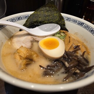 営業時間が長めで朝も昼も夜も食べられて駅近、今回は昼営業スタートの10時ちょうどに入店、お客さんは自分のみでした。 発券機にて食券購入をしてからお席に案内されます。外は猛暑だったので店内は涼しいかと思っていたのですがエアコンがあまり効いていなく蒸し暑かったのが残念、ですが卓上にピッチャーのお水が置いてあるのが嬉しいポイント、また自分で潰すタイプのにんにくもありました。 今回は迷った末に特製を注文、5分弱での提供でした。 特製は、チャーシュー、角煮、味たま、メンマ、海苔、キャベツと具沢山で食べ応え抜群!特に角煮は炙られているのか外側は香ばしく、お肉自体は柔らかく脂もおいしい!チャーシューは薄めでしたがこちらも脂の質がよく好みでした。またスープに浸っているキャベツによってちゃんぽん感がでていてそれが面白かったです︎^_^ 豚骨スープ自体は、こってりすぎずあっさりすぎずと...続きを食べログで見る