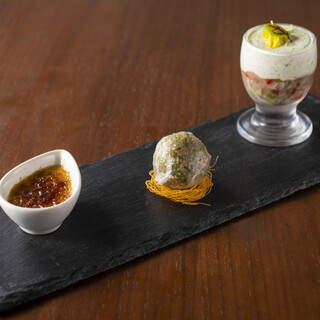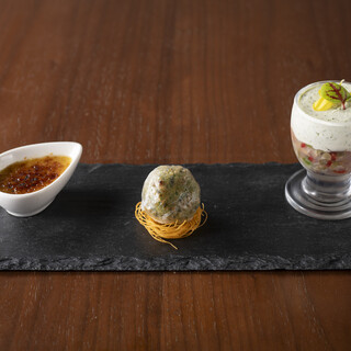 コースを予約して来店しました。 メニューは写真に載せておりますのでご参考に! 彩り豊かで美しい飾り付けのなんともフレンチらしい品々が並びます!味も申し分なし!お皿も可愛らしいです! 特に3品目のリエットが気に入りました。また食べたい! 終始大満足のコースでした!