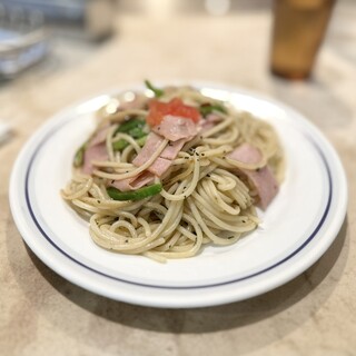 2025年5月31日18時10分の訪問です。今日は品川駅乗換で移動がありどこかで入れて行こうと思って伺いました。店前は並びはありません。券売機で迷わずナポリタン(880円)をポチッとな。自動ドアから入るといらっしゃいませお好きな席にどうぞと案内されます、6割位の入りですかね。並ばずにラッキーです。お冷と紙ナプキンで包まれたフォークがやって来ました。伝統的なナプキン使いを見ると気分が上がりますね。待つこと5分程でお待ちどう様とナポリタン登場です。300gと言うことですがそんなに圧力はありません。早速そのままいただきます。 うわーコレ好きな奴です。ケチャップメインの何の捻りも無い喫茶店のナポリタンです。麺もふっくらモチモチ、アルデンテなんてどこ行った?という感じです。具材も王道です。ピーマン、玉ねぎ、缶詰のマッシュルーム、ウインナー。しかもウインナーがやたらと美味しい。粗挽きみたいな食感です...続きを食べログで見る