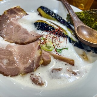 京都ラーメンという触れ込みの森井さん。実はこちらのお店の銀座店を、アムステルダム出張中に現地社員から知ってるかと言われていました。間違いなくインバウンド向けのお店でしたが、烏山のこちらはそんな感じでもありません。熟成醤油をポチってカウンターへ。 まず細麺か太麺が選べます。デフォは細麺のようなのでそちらを。背脂も普通とか多めとか選べますが、身体のために無しをチョイス。ネギも量が選べます。色々選択肢の多いお店ですね。 さて到着した丼は、これの何が京都ラーメンなのかよくわかりません。京都発祥?ということでしょうか。確かに細麺と九条ネギの感じは京都を思わせますが。 さあスープから、うん実にあっさりしている、パンチは弱め。 続いて麺リフト、綺麗な麺です。スルッと口に入ってきます。ただこちらもパンチは弱め。 チャーシューもパンチ弱め。ちょと意外性の連続です。 結論、これは背脂ありきのラーメ...続きを食べログで見る