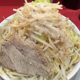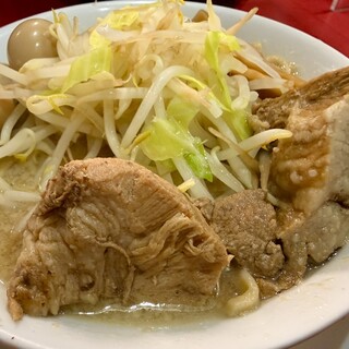あっ晴れに行って来ました。 訪問したのは、ある平日の19時半ごろでした。 店内はほぼ満席で、期待値が一気に高まりました。 券売機で食券を購入し、好みを伝えて席へ着きました。 今回いただいたのは、普通のら〜めん全部乗せでした。 丼が到着した瞬間、その迫力に思わず見入ってしまいました。山のように盛られたもやしとキャベツ、その頂にうずら卵とメンマが鎮座しており、まさに二郎系らしい圧巻のビジュアルでした。 スープは乳化した豚骨醤油で、ひと口すすった瞬間にコクと旨みが一気に広がりました。 今回はニンニクのみマシマシにしましたが、パンチのある香りが全体を引き締め、重厚ながらもバランスの良い味わいでした。 脂やカラさを普通にしたことで、豚の旨みをダイレクトに感じられました。 極太麺はワシワシとした硬めの食感で、濃厚なスープとよく絡み、噛むほどに小麦の風味が広がり、食べ応...
