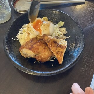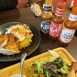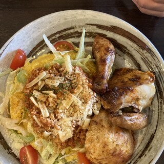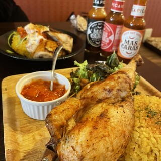 洛北のイズミヤによく出張されてるお店 気になって訪問 この時期になると、チキンが食べたくなります でも、ケンタじゃない そうそう、もっと前に来るべきだった 本日は、丸ごと半身にライス、スープセット 1350 ツレが、チキンライス(サラダシェイク付)2ピース 1100 チキンはブラジル産を使用されてるようで 小ぶり(イメージ半分くらい) 焼き加減良く、めっちゃジューシー 味変のソースも辛めだけど美味しい 4ピースは結構満腹に、2ピースだともうちょい欲しいって感じ サラダのドレッシングが甘めでめっちゃ美味しかった 辛めのチキンソースとのバランスよし続きを食べログで見る