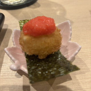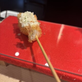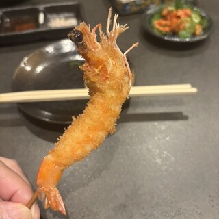 大阪らしい食べ物をとお好み焼きと迷いましたが串揚げ屋に。思った以上にシックな大人な雰囲気。 串揚げの置き皿が家の形みたいな五角形。底に四種類のソースが入れられるように。オシャレな器。お店の特製ブレンド塩、黒ソース、味噌ソース、醤油ソース。串揚げに一番合うソースの近くに置いてくれます。 ランチは7本、10本、15本のコースがあり。10本にして、ご飯の代わりに2本追加できるとのことでそのオプションに。これにキャベツ&野菜スティック(お代わりオッケー)、デザートがついて5500円。 串揚げ待ってる間に野菜を。甘いキャベツ、みずみずしい大根、人参、パプリカ、ネギ。彩りも綺麗だし美味しくて2回お代わりしちゃいました。こちらから言わずとも店員さんが持ってきてくれました。 で、串揚げスタート。最初はエビとキス。オススメの塩で。エビはプリンプリン。そして香ばしい。キスも身がホクホク...