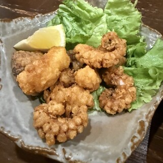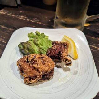 おまかせ串3種、鶏の唐揚げ、日替わり小鉢(石橋バルメニュー)紀州備長炭使用!炭火に拘る焼鳥屋さん!!!