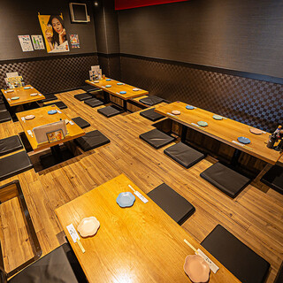 『海鮮れすとらん 魚輝水産 JR平野駅前店』は、新鮮な魚介とにぎやかな雰囲気が地元で評判の居酒屋です。 木目を基調にした落ち着きのある空間で、お一人様から宴会まで幅広くご利用いただいています。 本マグロを使った刺身や寿司をはじめ、名物の串カツも多くのお客様にご好評いただいています。