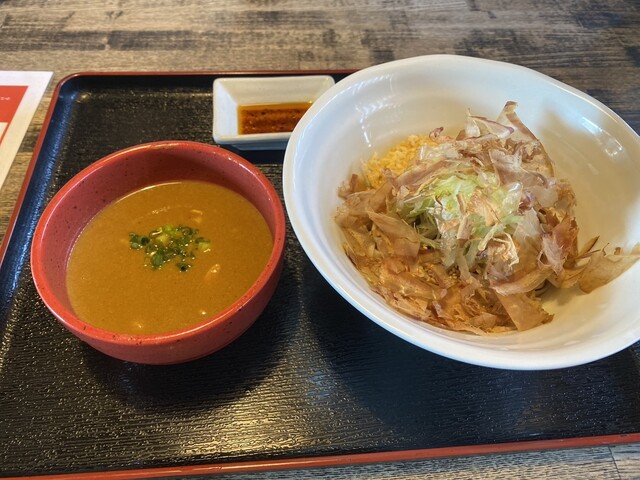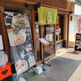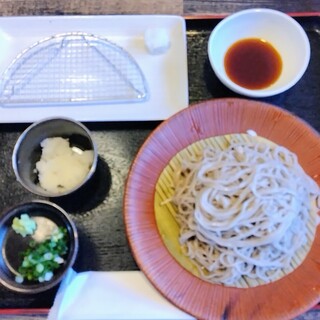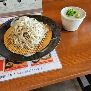 38010876,黒船soba さんが10周年記念という事で花輪が出てます。 因みに、10周年はグループ全体の話で、こちらの樽味店は新しく出来て1年ちょっとになります。 卓上のメニューに【十割ざるそば】が十周年感謝祭として【1,100円⇒770円】となってました。 ざるそば単品で1,100円は少々高い気がしますが、770円なら妥当なところでしょうか? 看板メニューの【黒紅そば】は割引はしてないようです。 【十割りざるそば 770円】 【十割りおろしそば+ミニ天丼セット 1,540円】 十割そばは機械製麺ながら打ちたての茹でたてなので、しっかりつながった弾力のある蕎麦になってます。 蕎麦の香りはそれ程感じられませんでしが、十分に美味しい蕎麦といえるでしょう。 おろし(165円)は別盛りでそばちょこにたっぷりと入って出てきます。 辛味も十分にある大根でした。 ...続きを食べログで見る