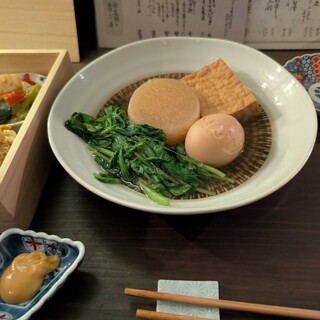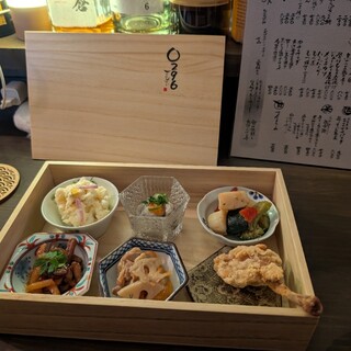 福岡市内にあるお店です。西鉄平尾駅から結構歩きましたね。決して駅近のお店ではありません。ちょっと不便な場所にあるんですが、それでも旨いおばさいが評判で、多数のお客さんで賑わっていましたよ。 お店はちょっといい感じの小料理屋といったところか。カウンターメインで奥にテーブル席も少々あり。 魅力的なおばんさいが色々とラインナップされています ・おばんさい箱 2200円 さしみたくのり 夏野菜のラタトゥイユ 野菜の煮浸しジュレ ポテトサラダ つぶ貝煮 鱚南蛮 ・銀鱈西京漬 880円 ・おでん がんもどき 200円 大根 250円 ・黒霧島 600円 ・日本酒 十勝 800円 ・日本酒 りんごぽむぽむ 680円 注文したのは以上です。 お店の看板メニューはおばんさい箱です。 いろんなおばんさいの盛り合わせだね。 このおばんさいが実に旨い...続きを食べログで見る