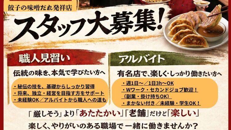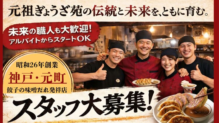 ◆未経験から接客デビュー!調理補助!南京町で“手に職&接客力”が身につくバイト。 (昼だけ・夜だけOK/週1〜OK) 餃子専門店でのお仕事です。未経験の方も大歓迎! 【ホール(接客)】 ご案内、オーダー、配膳、片付けなどがメイン。 「接客って難しそう…」という方も、最初は笑顔と挨拶から。先輩が横について丁寧に教えます。 【調理補助】 仕込み、盛り付け、簡単な調理補助からス...続きを見る